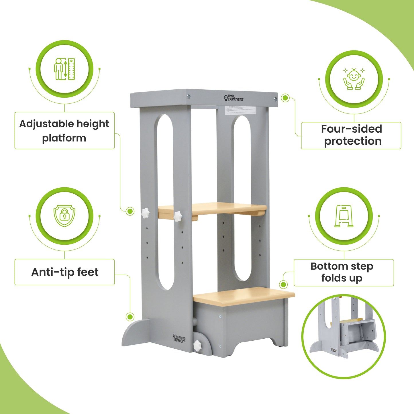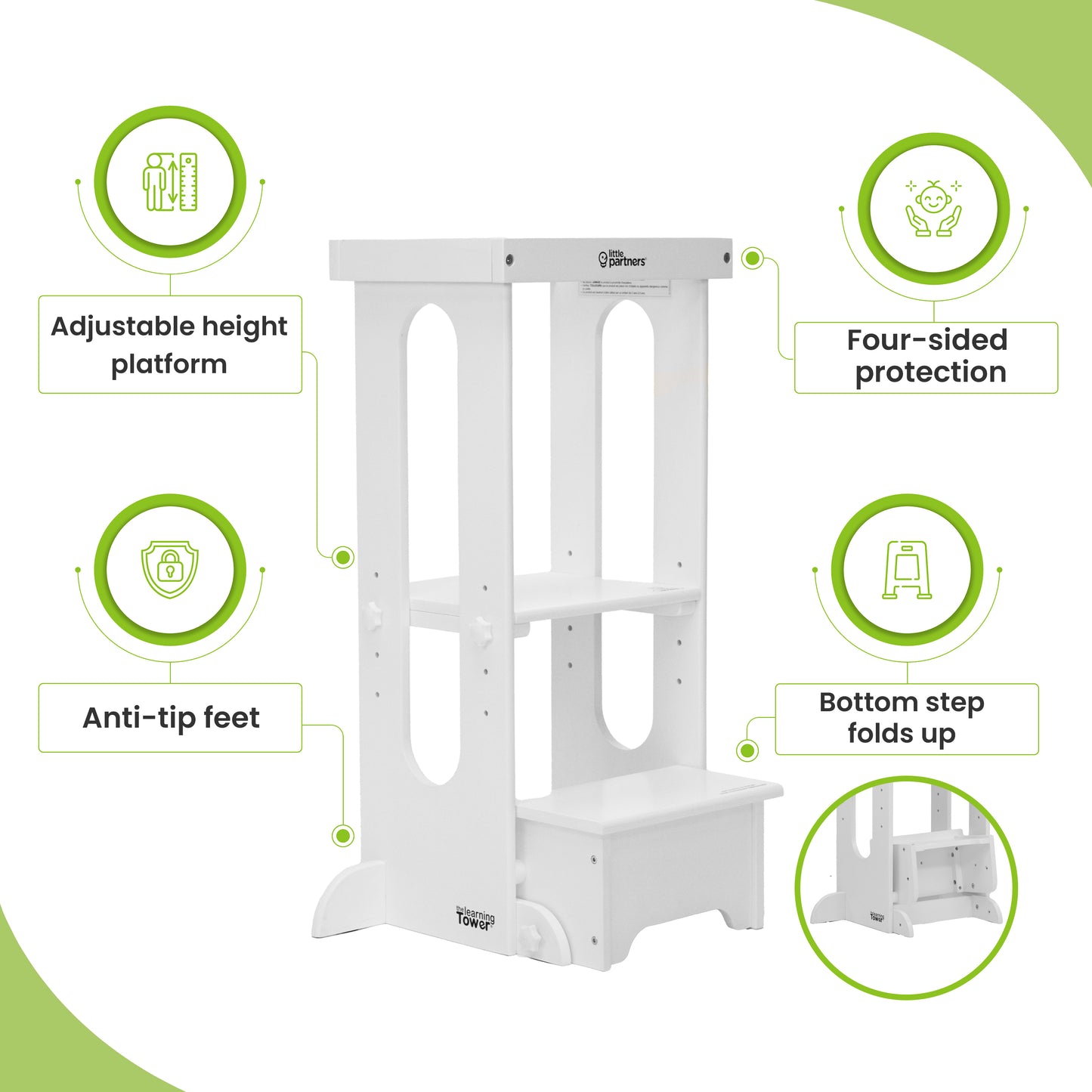 With four different height options to grow with your child throughout the years, the Explore 'N Store® Learning Tower® features a bottom step that folds up and away when not in use, allowing you to easily slide the entire tower a countertop or island for out-of-the-way storage.